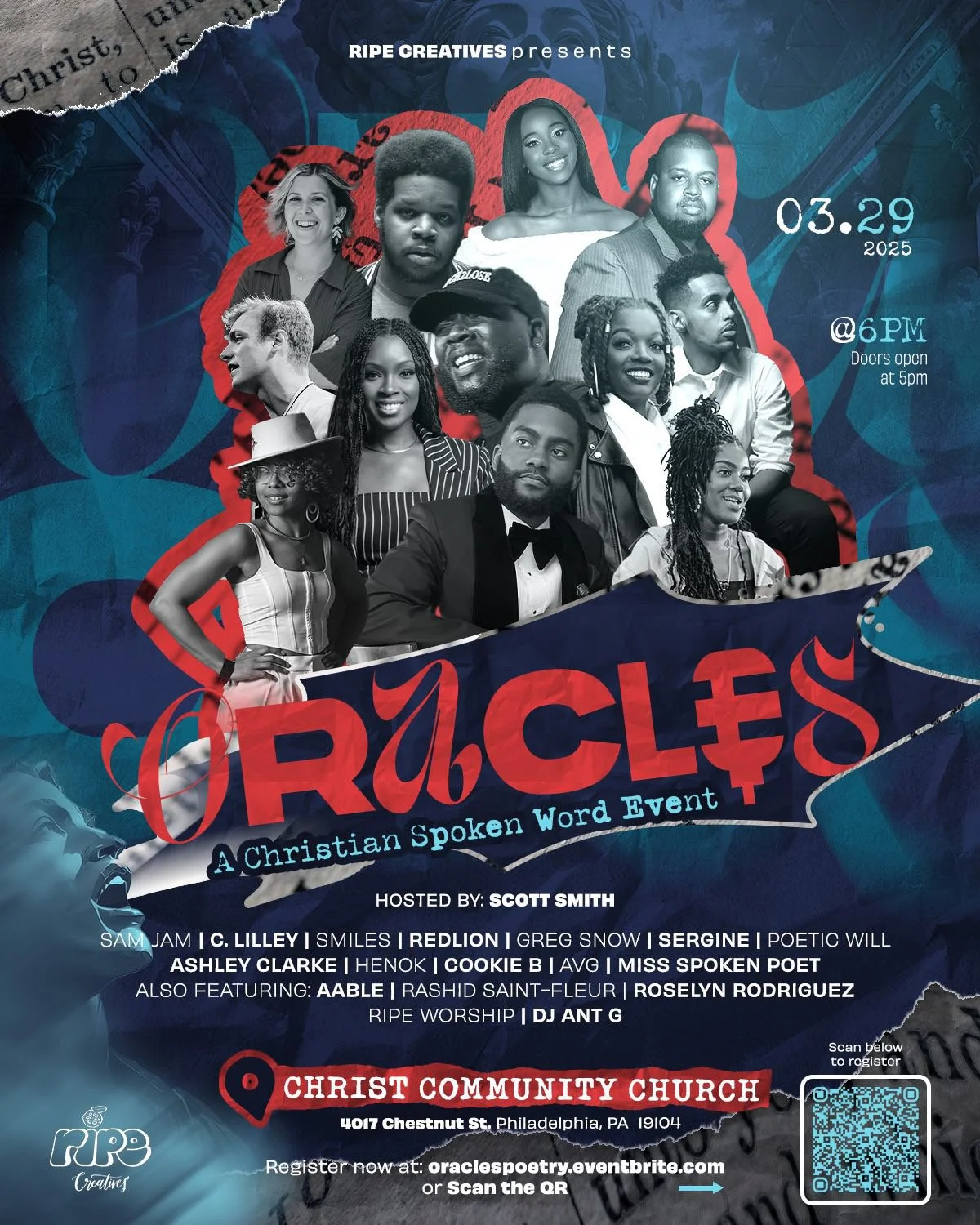 ORACLES Saturday, March 29, 2025 5:00 PM 9:00 PM Google Calendar ICS AVG, the Ripe Poetry team, and several other artists across the nation are coming together to bring you one of the biggest Christian Spoken Word showcases of the year! Artists are displayed in greyscales wearing a variety of clothing styles.